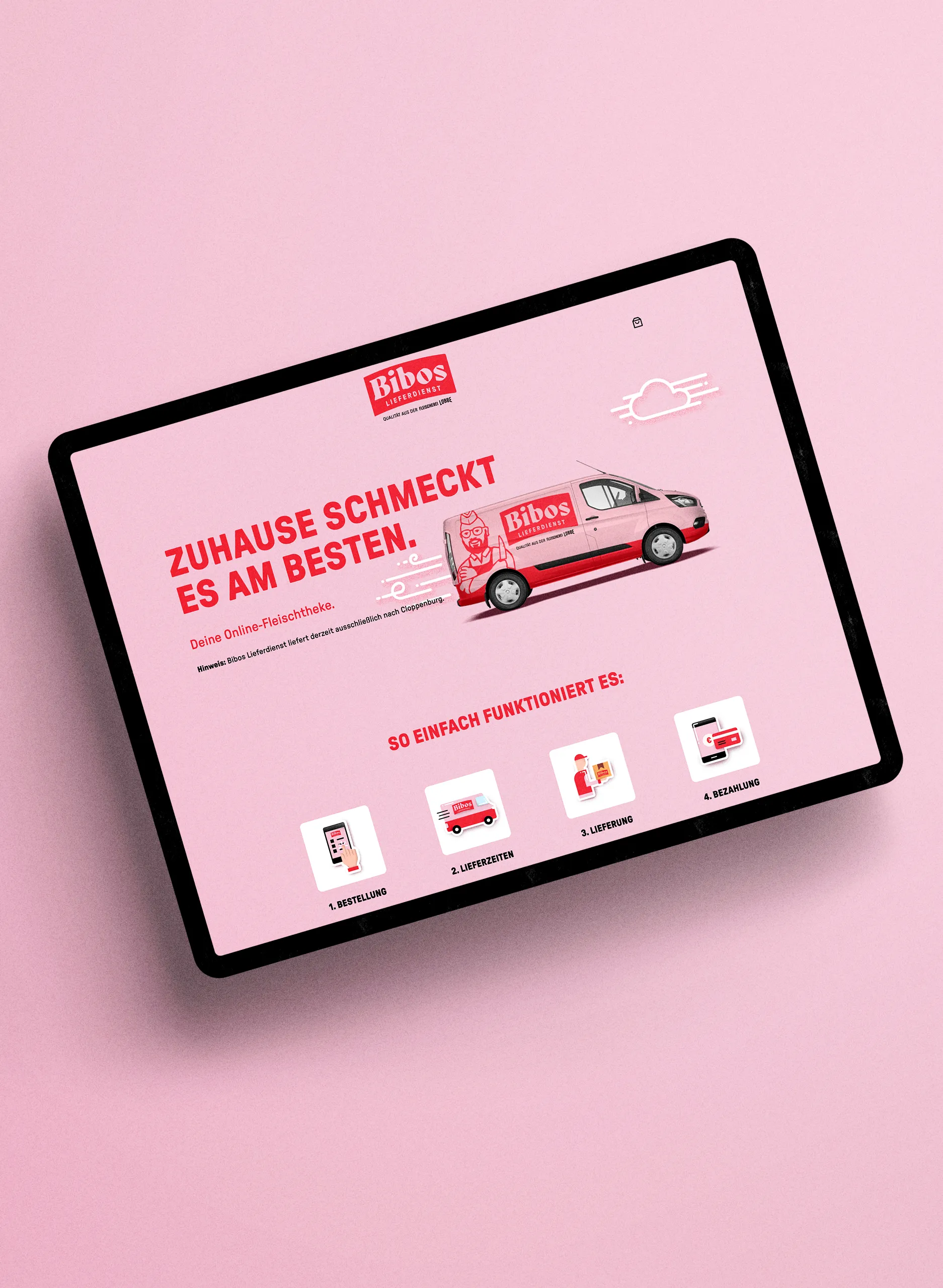 Der Inhaber der Fleischerei Lübbe heißt Marcel Timmerevers, Spitzname Bibo. Warum? Lange Geschichte. Auf jeden Fall ist er so mutig, dass er unseren Vorschlag fürs Naming direkt angenommen hat. Marcel, äh Bibo bringt frische Waren und echte Hausmannskost direkt vor die Haustür. Kein Schnickschnack, kein Gedöns — einfach gutes Zeug.